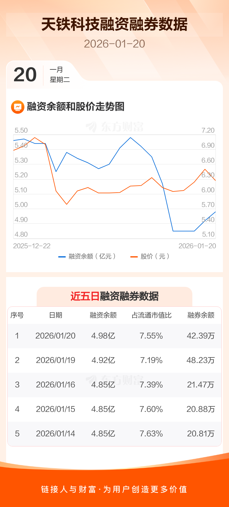 交易所最新数据显示,天铁科技于2026年1月20日获融资买入2048.32万元,融资偿还1455.84万元,当日融资净买入592.48万元。目前,该股融资余额4.98亿,占流通市值比例为7.55%。