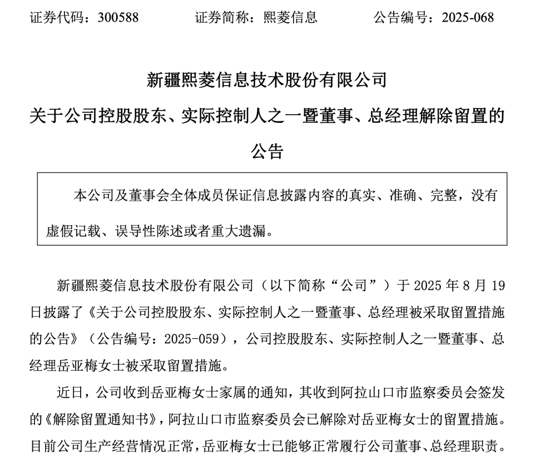 回溯至今年8月19日,熙菱信息曾披露,收到上市公司控股股东、实际控制人之一暨董事、总经理岳亚梅的家属通知,阿拉山口市监察委员会对岳亚梅立案调查并采取留置措施。彼时,熙菱信息公告明确称,上市公司其他董事、监事和高级管理人员均正常履职,熙菱信息组织架构及内部控制机制完善,董事会运作正常,控制权未发生变化;在此期间,熙菱信息董事长何岳代行总经理全部职责。