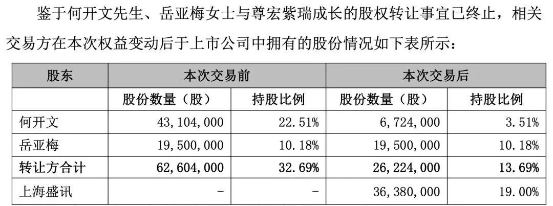 10月13日,熙菱信息披露上述股权转让进展情况,上市公司收到控股股东、实际控制人何开文及岳亚梅授权代表通知,其经与深圳前海尊宏伟业资产管理有限公司(代表“尊宏紫瑞成长1号私募证券投资基金”)友好协商,双方决定终止此前签订的股份转让事宜,并签署了《终止协议》。即终止何开文、岳亚梅原拟通过协议转让方式向“尊宏紫瑞成长”转让合计持有的熙菱信息1159.9万股无限售流通股,上海盛讯已就该股权交易终止事项出具无异议函。