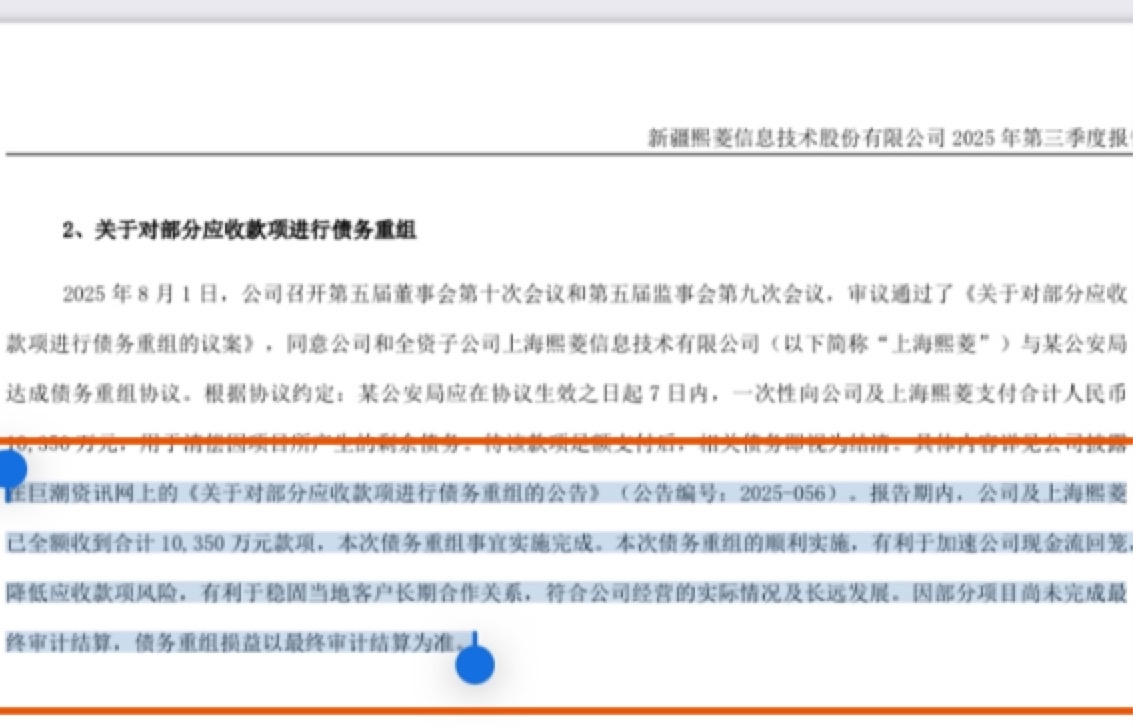 $熙菱信息(SZ300588)$ 截止第三季度,已收到一亿元债务重组款,审计未完成所以没体现在第三季度,那么年报就是为正利润