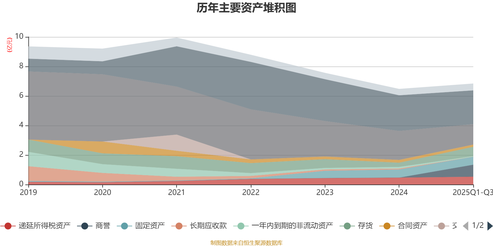 资产重大变化方面,截至2025年三季度末,公司商誉占公司总资产的11.94%,上年末为0;应收票据及应收账款较上年末减少29.37%,占公司总资产比重下降10.06个百分点;存货较上年末增加120.18%,占公司总资产比重上升4.8个百分点;货币资金较上年末减少5.29%,占公司总资产比重下降3.86个百分点。