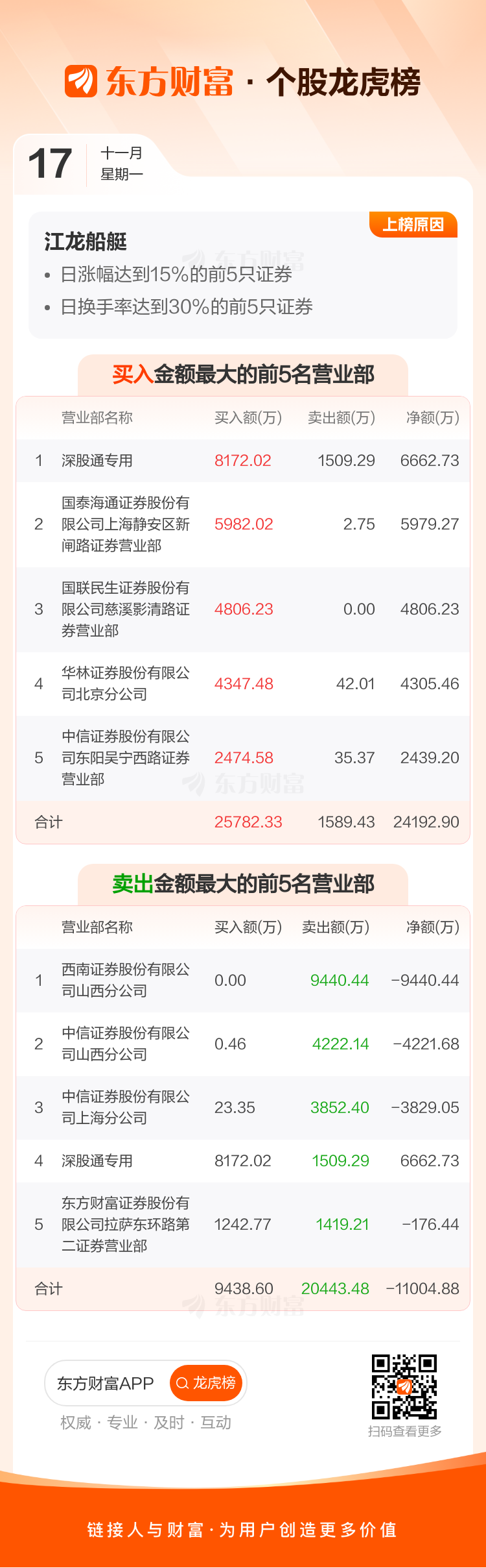 交易所2025年11月17日公布的交易公开信息显示,江龙船艇因成为日涨幅达到15%的前5只证券、日换手率达到30%的前5只证券上榜。江龙船艇当日收报16.31元,涨跌幅20.01%,偏离值20.00%,换手率45.88%,成交额17.01亿。