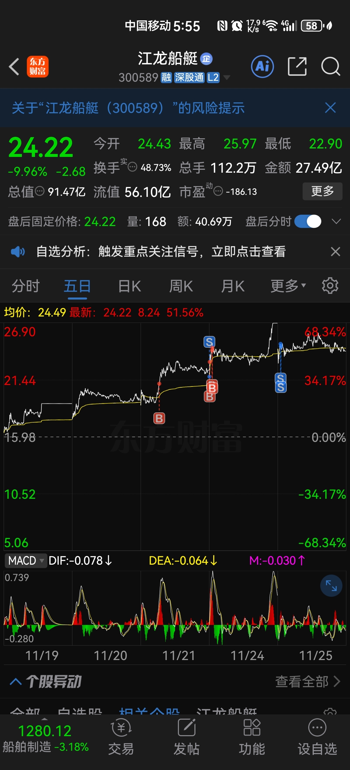 昨天瞎了狗眼乱加仓赚14个点,开盘打到14个点,忍住会拉8个点直接砸了,最中赚4.5个点止盈走了。。今天就算军工反弹也不会买你了 ,我会直接买龙一去。你这跟风的垃圾庄股