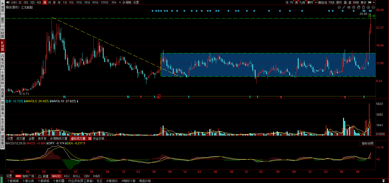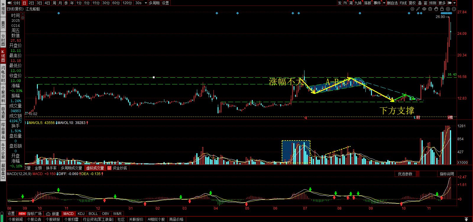 军工装备之——江龙船艇上涨结束了吗?周线,碰前头,出现回调。日线,涨停后,出现孕
