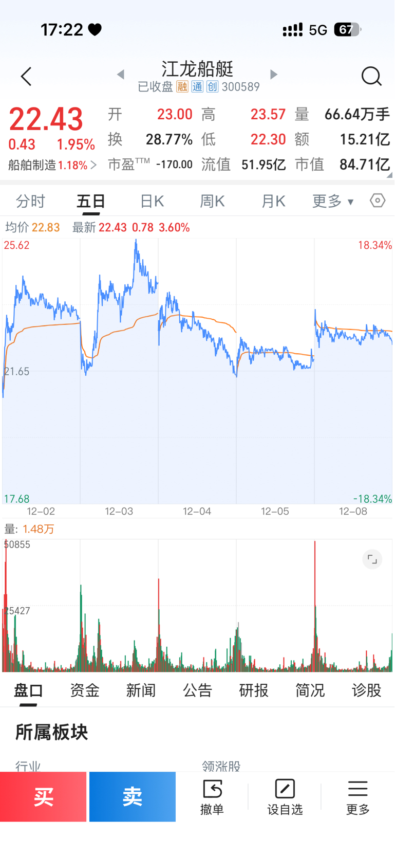 $江龙船艇(SZ300589)$ 根据近五天的波动,大胆预测明天开盘价就是明天的最高价