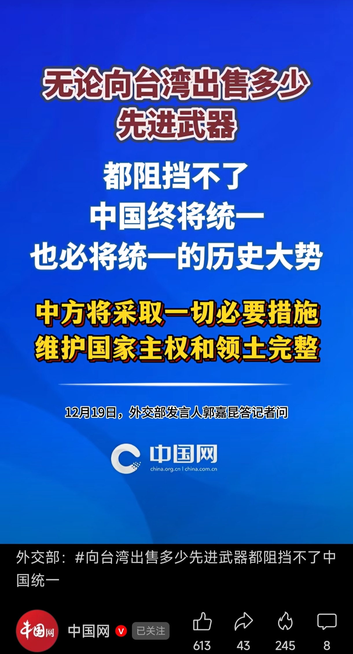 中国网发布:外交部:#向台湾出售多少先进武器都阻挡不了中国统一