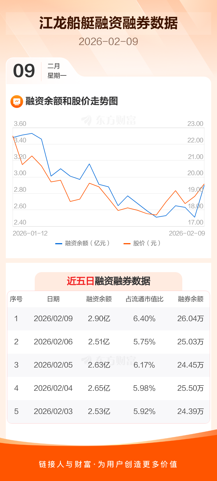 交易所最新数据显示,江龙船艇于2026年2月9日获融资买入9800.10万元,融资偿还5864.19万元,当日融资净买入3935.91万元。目前,该股融资余额2.90亿,占流通市值比例为6.40%。