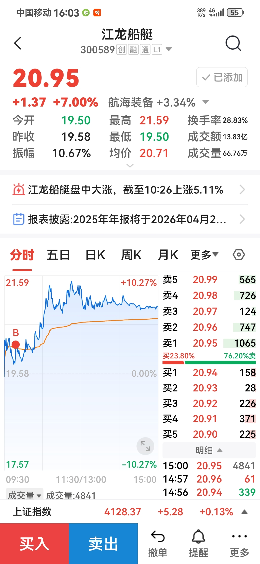 $江龙船艇(SZ300589)$ 今天重新踩上五天线,后市可期!