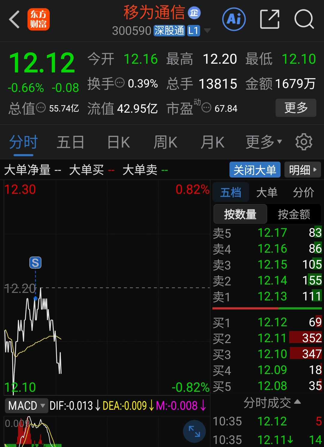 $移为通信(SZ300590)$ 亏了100元割肉了!哎!