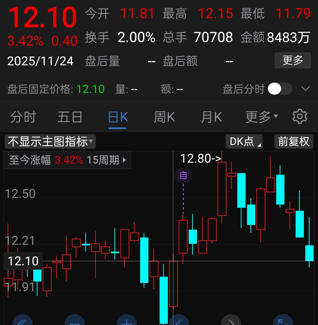 $移为通信(SZ300590)$ 箱底12.06收12.10三天打回11月24日位置支撑12.10元,60分钟图12.06有点支撑力,中长线持有