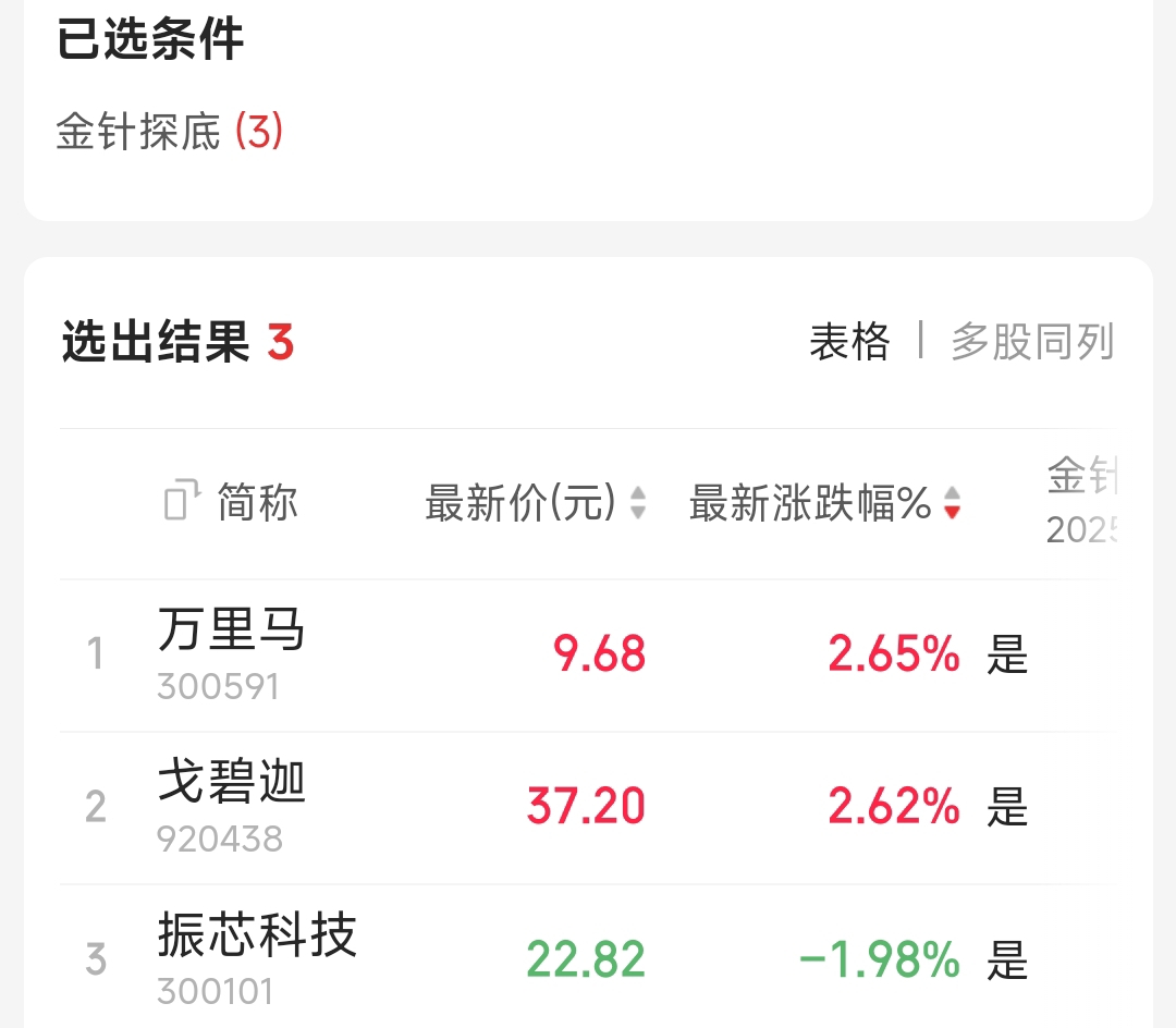 我们逐一分析万里马、戈碧迦、振芯科技的金针探底形态,从结构、支撑、量能等维度判断其后续走势: