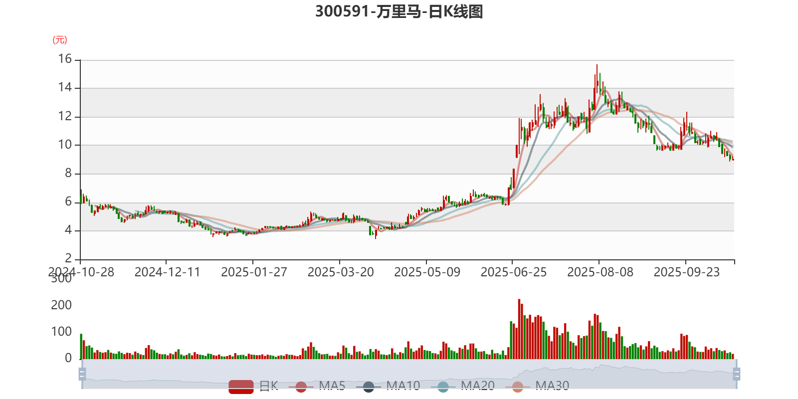 中证智能财讯万里马(300591)10月27日披露2025年第三季度报告。前三季度公司实现营业总收入3.66亿元,同比下降15.68%;归母净利润亏损6583.26万元,上年同期亏损6517.05万元;扣非净利润亏损6501.82万元,上年同期亏损6553.78万元;经营活动产生的现金流量净额为-8942.89万元,上年同期为-4097.45万元;报告期内,万里马基本每股收益为-0.1623元,加权平均净资产收益率为-23.43%。