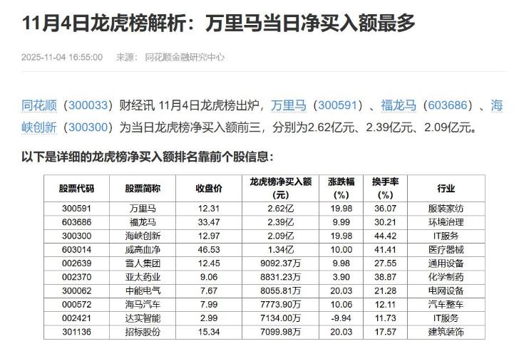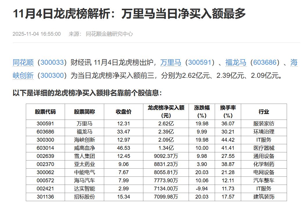 财经讯11月4日龙虎榜出炉,万里马(300591)、福龙马(603686)、海峡