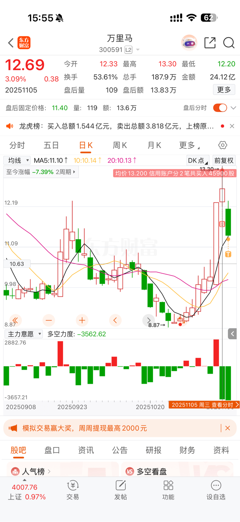 $万里马(SZ300591)$ 昨天13.2全仓追的,怎么办