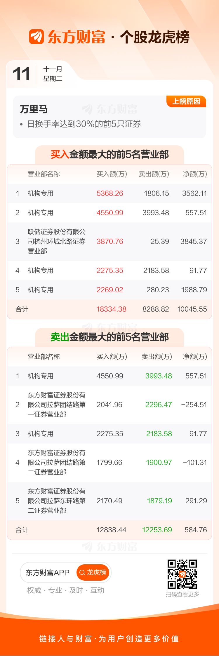 交易所2025年11月11日公布的交易公开信息显示,万里马因成为日换手率达到30%的前5只证券上榜。万里马当日收报12.42元,涨跌幅7.35%,偏离值40.54%,换手率42.93%,成交额18.70亿。