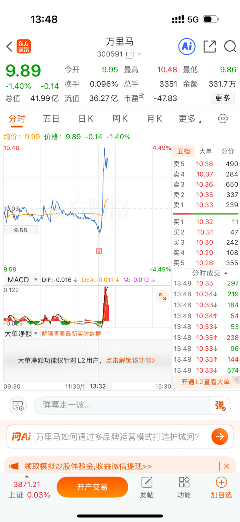 午盘9.89水下介入$万里马(SZ300591)$ #强势机会# #实盘记录# #投资干货# #投资随笔#