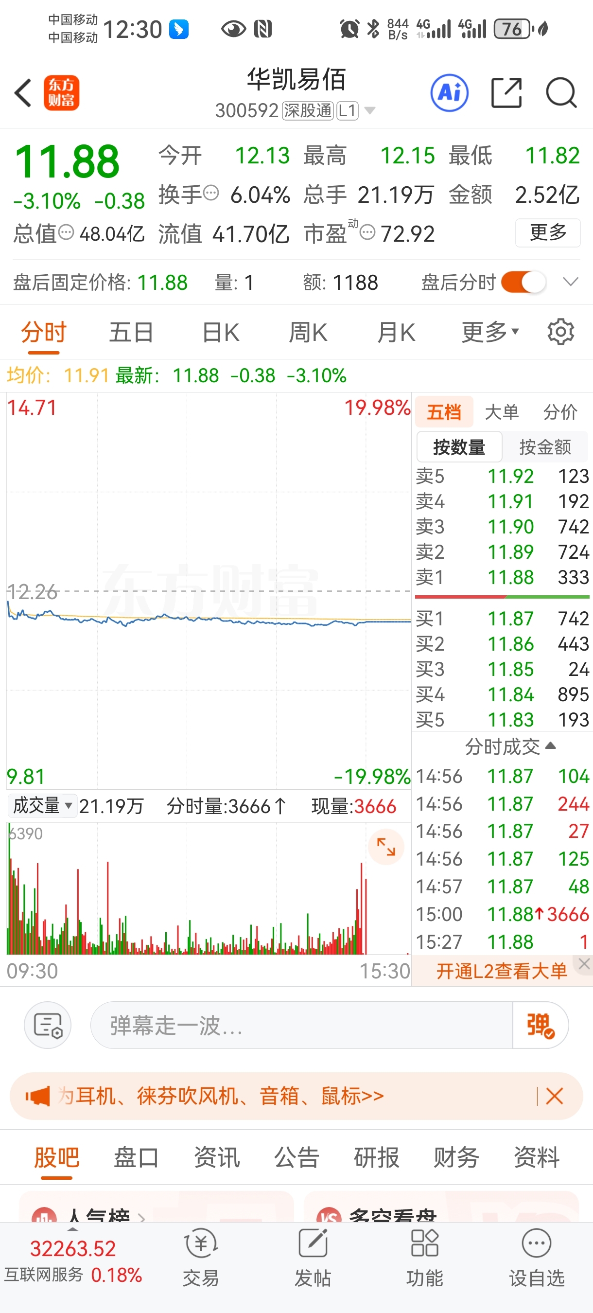 $华凯易佰(SZ300592)$ 我发现主力挂11.88卖出3999收,主力买了3666收,然后剩下333手11.88,我觉得主力会玩