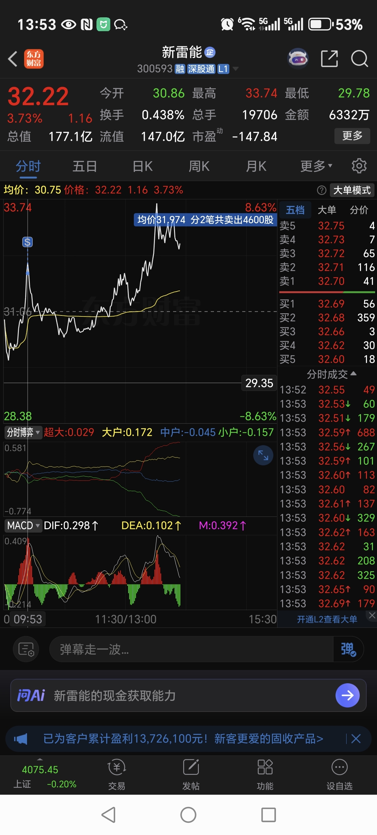 $新雷能(SZ300593)$ 卖早了