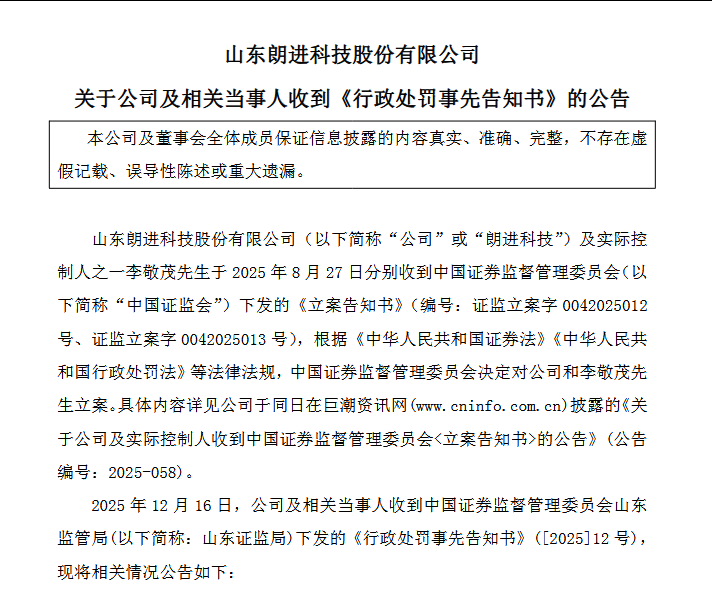 轨道交通空调制造商朗进科技(300594)12月16日晚间公告,公司收到山东证监局下发的《行政处罚事先告知书》,因关联方资金占用信息披露违法违规,公司及5名责任人合计将被处以超1000万元罚款,其中实际控制人李敬茂个人被罚440万元。
