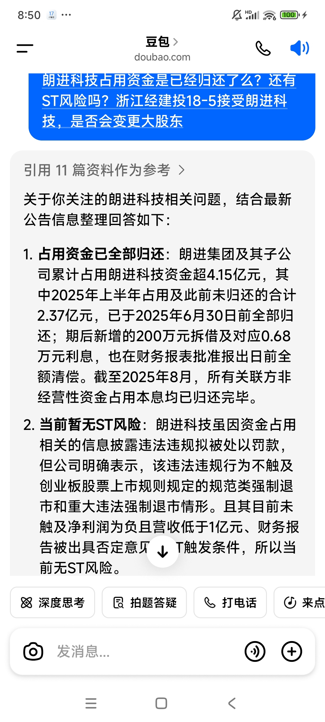 $朗进科技(SZ300594)$ 朗进科技占用资金已经归还,无ST风险,浙江经建投18.5接受朗进科技13%股份,有可能会变更大股东,朗进总市值不到15亿,已无下跌空间,旧事重提,有诱空之嫌