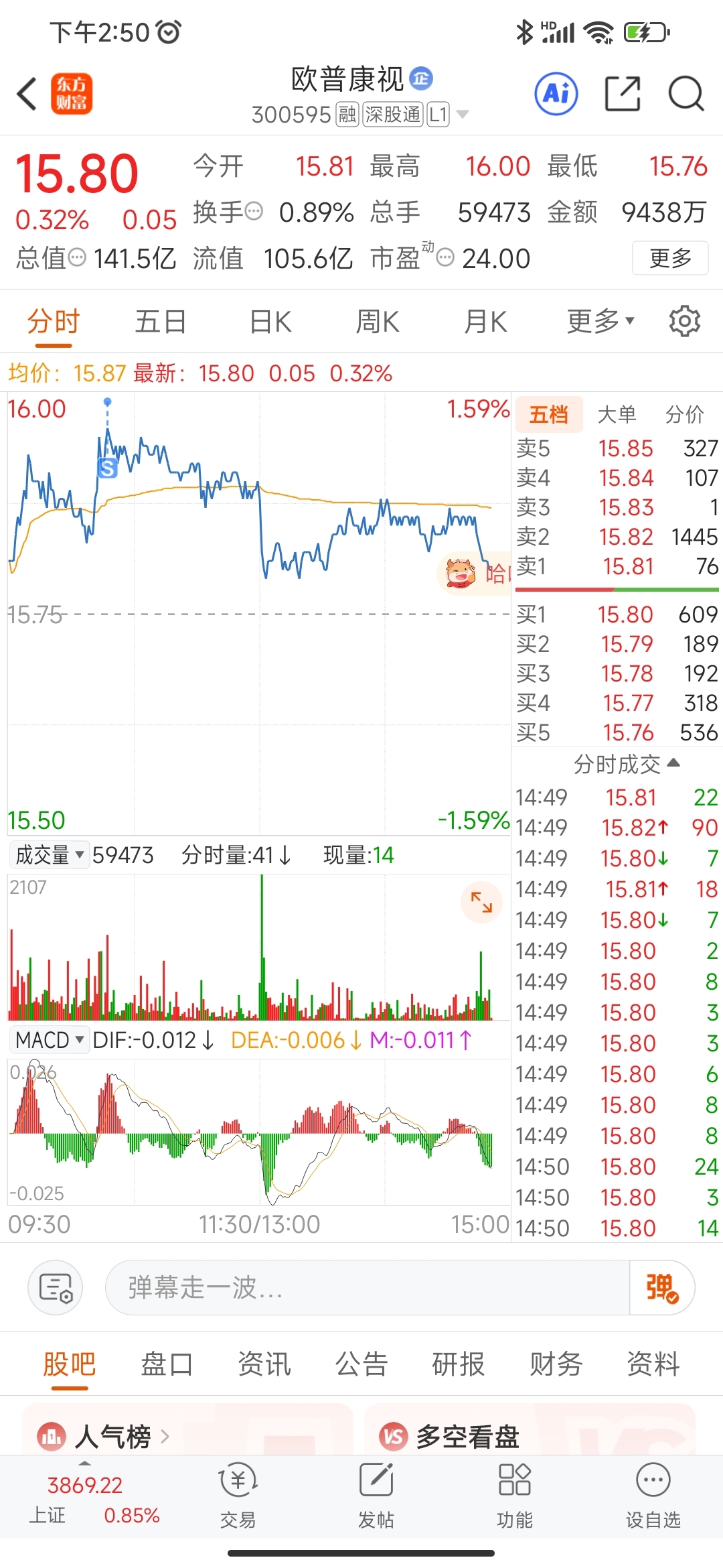 $欧普康视(SZ300595)$ 冲高得卖。。。