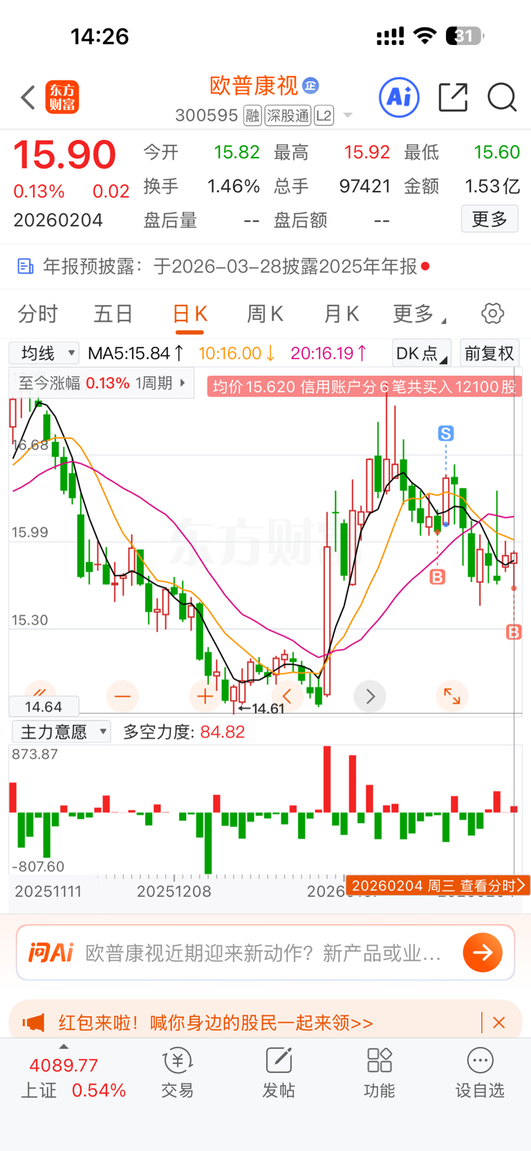 $欧普康视(SZ300595)$ 1月有人打电话喊我买。一直不敢买。今天忍不住又买了一点