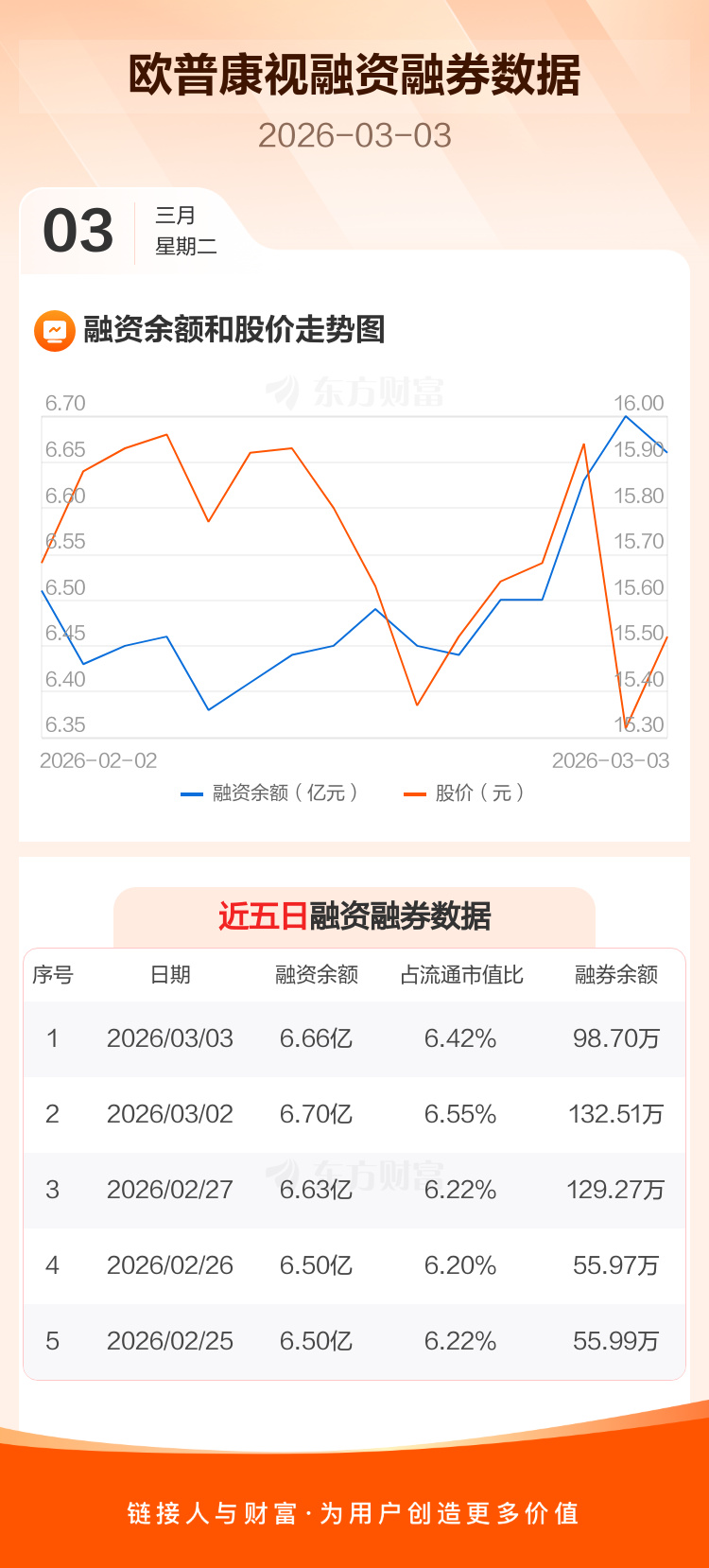 交易所最新数据显示,欧普康视于2026年3月3日获融资买入3083.96万元,融资偿还3528.69万元,当日融资净偿还444.73万元。目前,该股融资余额6.66亿,占流通市值比例为6.42%。