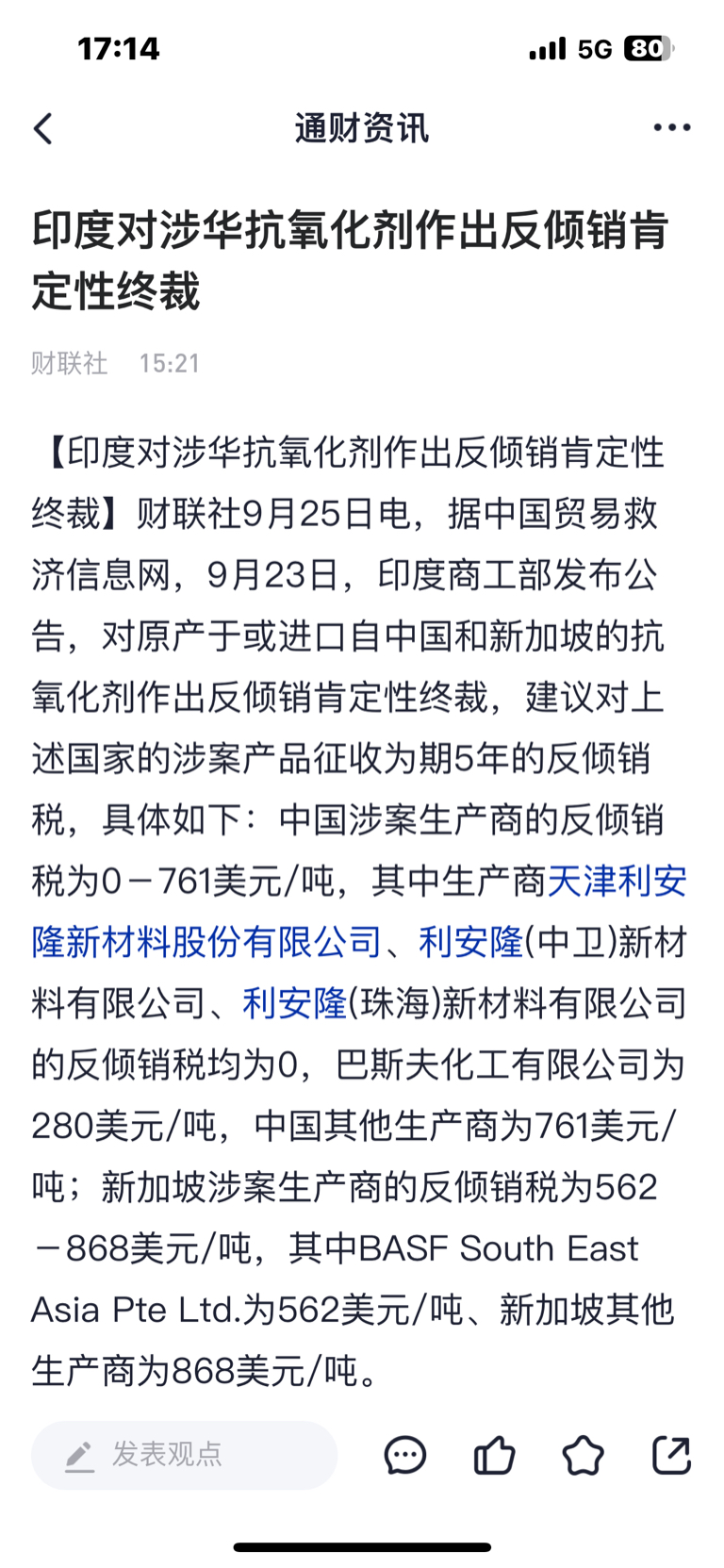 只有利安隆的反倾销税为零