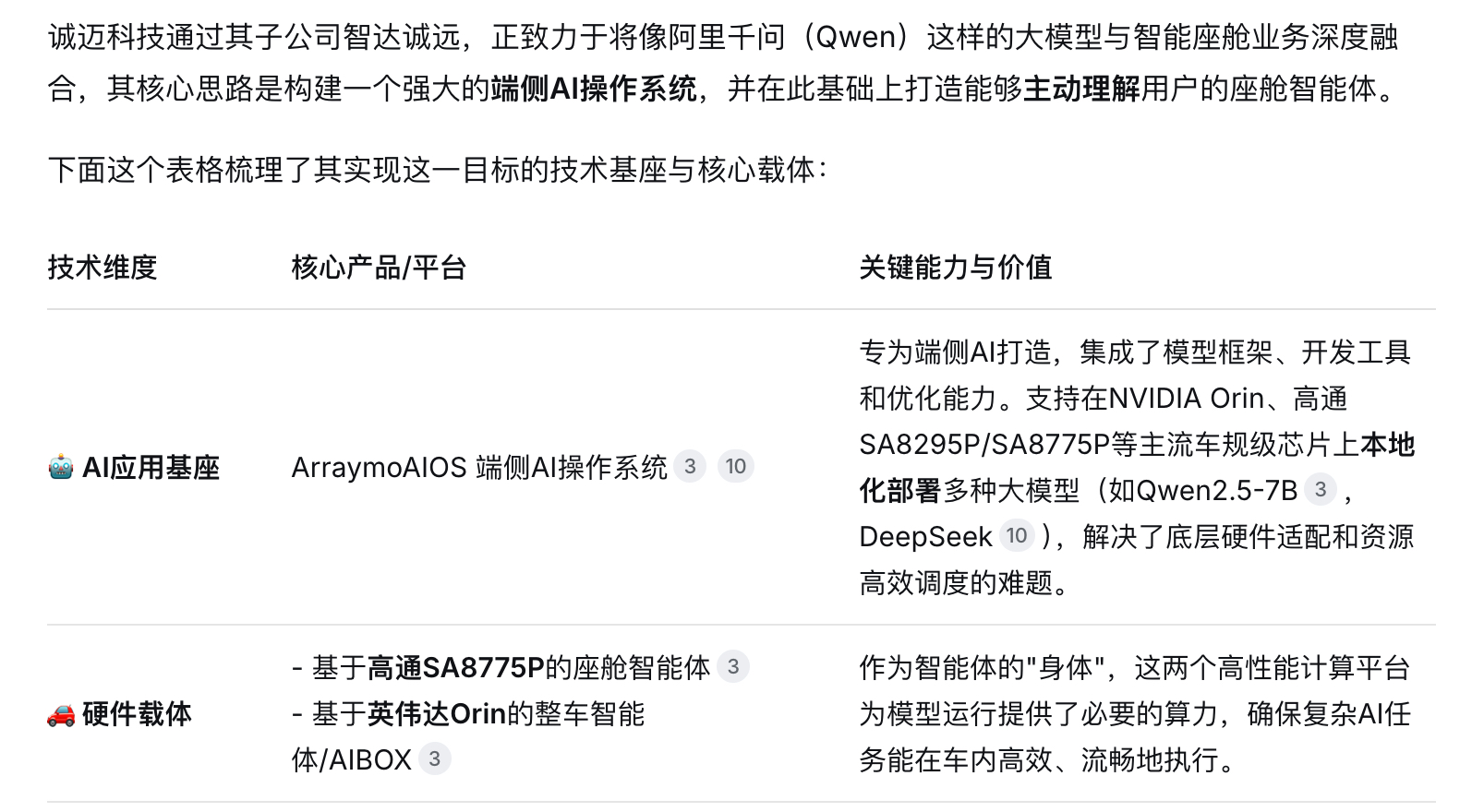 $诚迈科技(SZ300598)$ 诚迈科技通过其子公司智达诚远,正致力于将像阿里千问(Qwen)这样的大模型与智能座舱业务深度融合,其核心思路是构建一个强大的端侧AI操作系统,并在此基础上打造能够主动理解用户的座舱智能体。