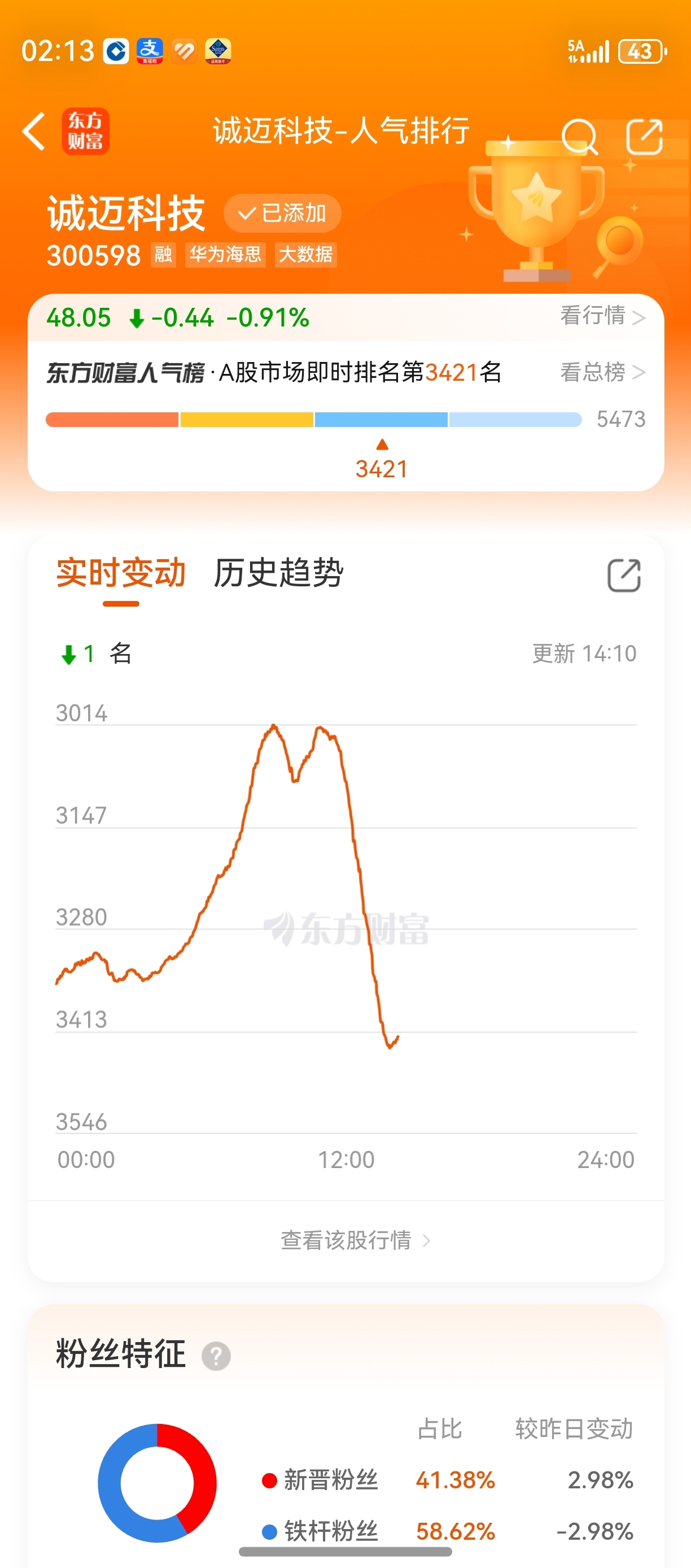 $诚迈科技(SZ300598)$ 人气焕散,明天危险了