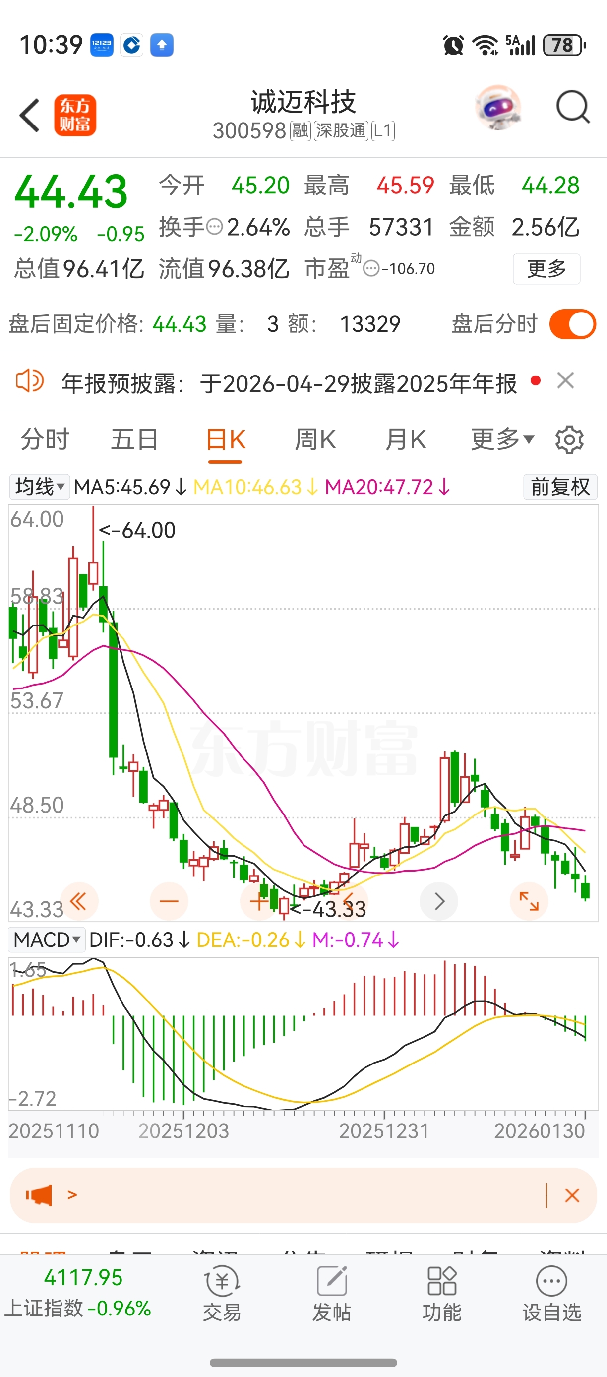 $诚迈科技(SZ300598)$ 业绩不好己经反应在股价上了,短线这波64下跌到44己经算超跌了,下周一低开继续加仓