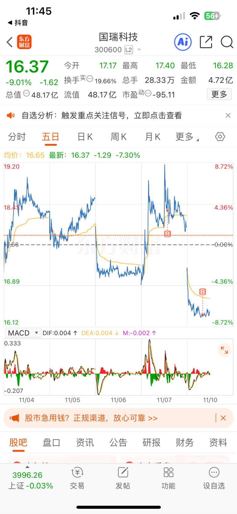 $国瑞科技(SZ300600)$ 这个短线今天吃大面了,缩量下跌 没有破关键k位置 加一点 没进的可以小仓位博弈 破关键k我会止损