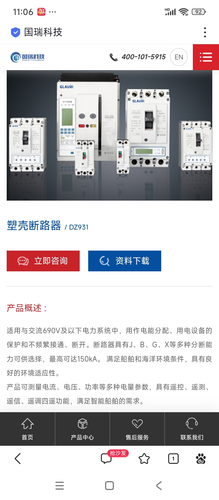 $国瑞科技(SZ300600)$ 公司官网显示产品塑壳断路器适用与交流690V及以下电力系统中,用作电能分配、用设备的保护和不频繁接通、断开。断路器具有J、B、G、X等多种分断能力可供选择,最高可达150kA。 满足船舶和海洋环境条件,具有良好的环境适应性。产品可测量电流、电压、功率等多种电量参数,具有遥控、遥测、遥信、遥调四遥功能,满足智能船舶的需求。助力添加智能电网概念