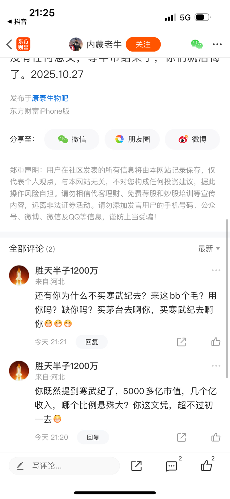 $康泰生物(SZ300601)$ 这个213给我拉黑了,他本来就是没水平,他要这样说茅台市值两万亿呢,净利润多少?前几年利息高一个亿一年就300多万,两万亿一年多少利息?他的比喻好像小学生说的,我告诉他分析的不对,还看不惯我拉黑我,这种人