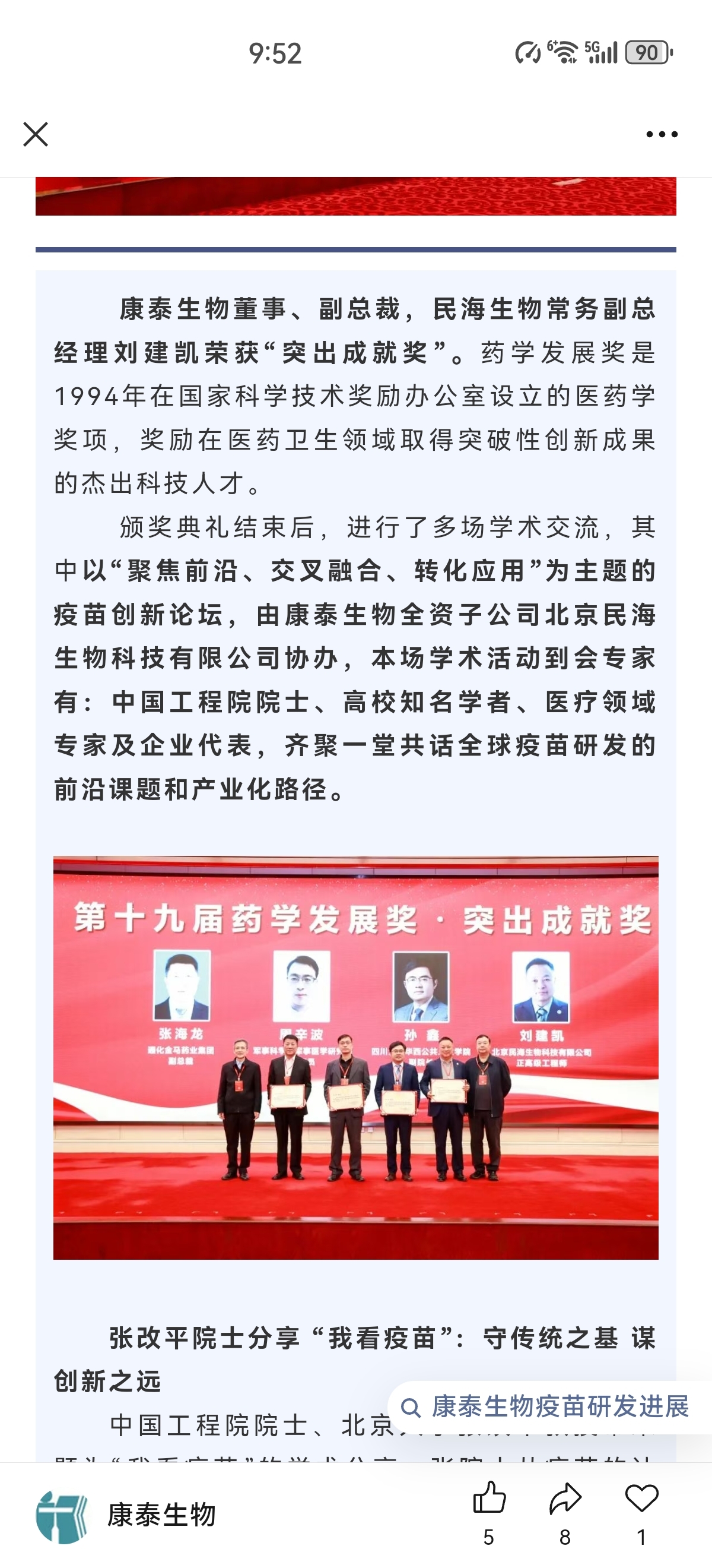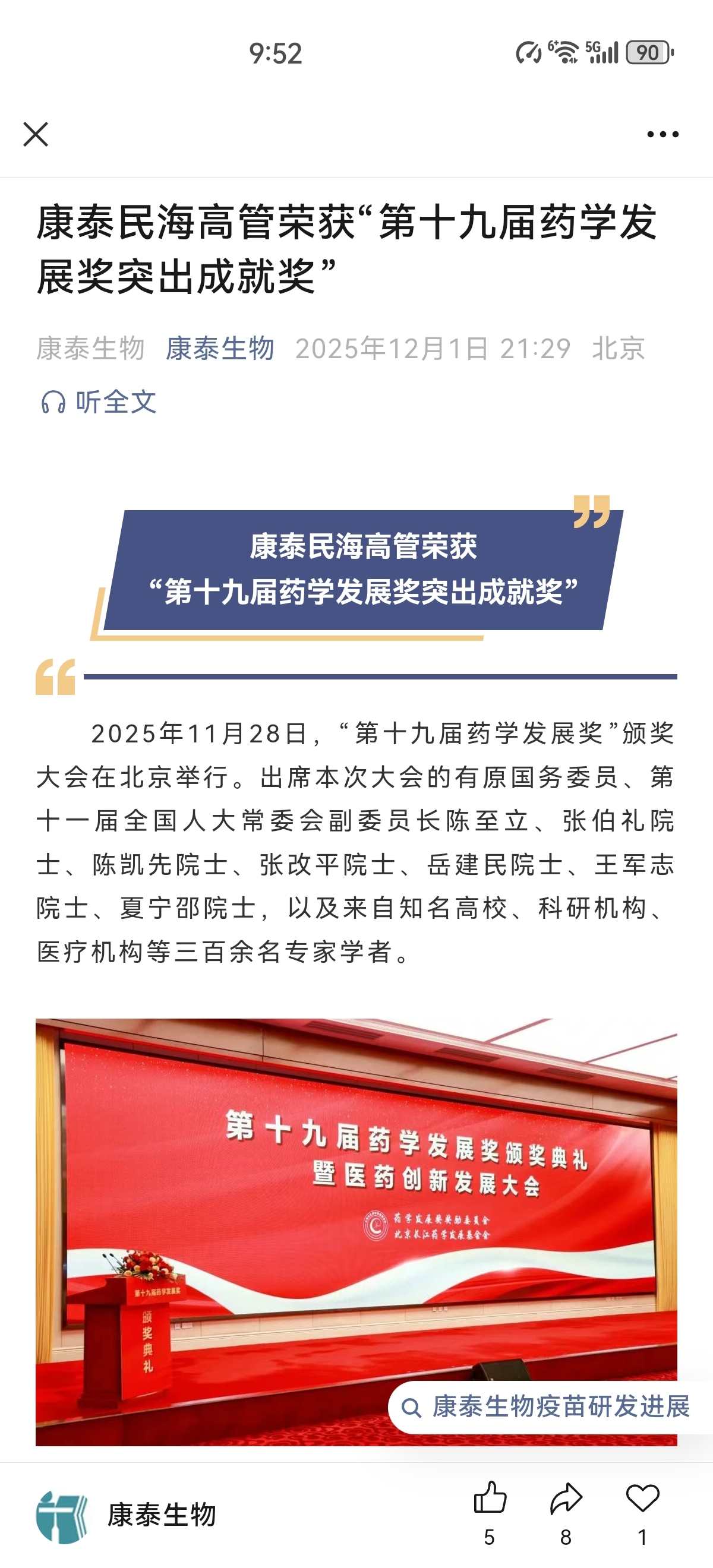 康泰高管获药学发展奖突出成就奖。其中提到超级耐药菌肺炎克雷伯菌疫苗研发突破,布局