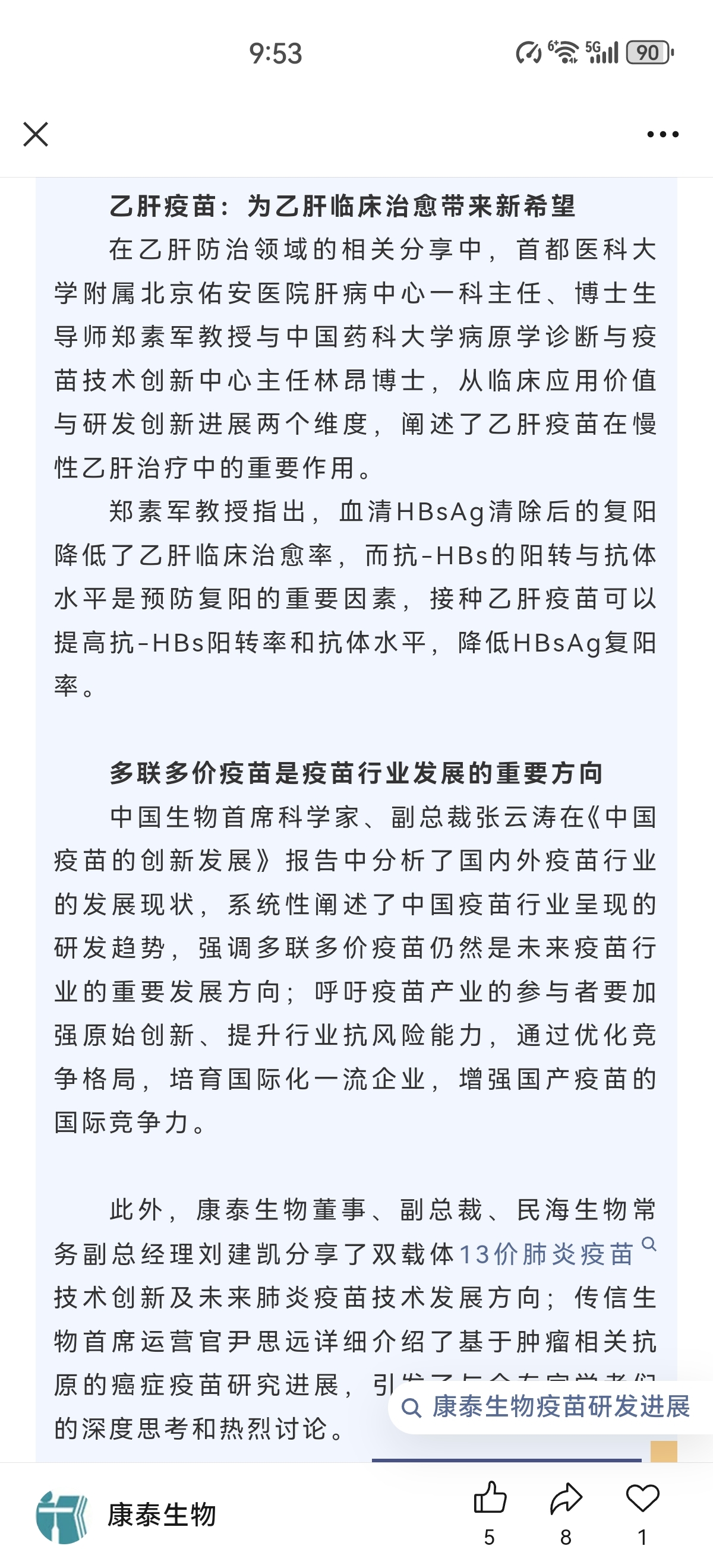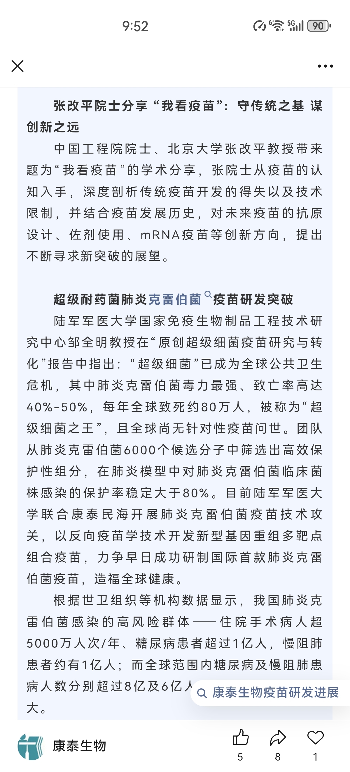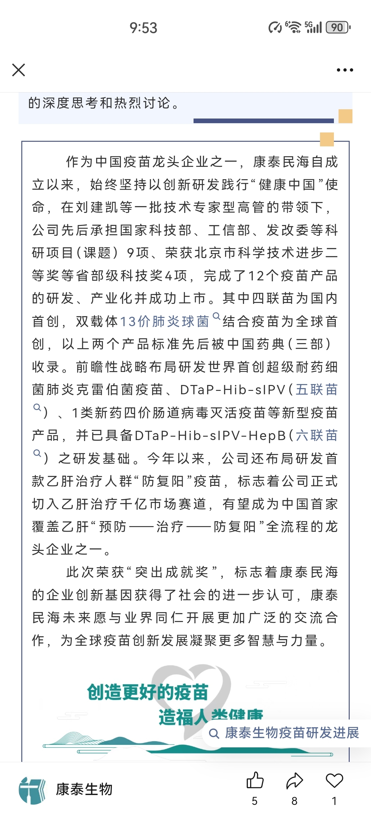 $康泰生物(SZ300601)$ 康泰高管获药学发展奖突出成就奖。其中提到超级耐药菌肺炎克雷伯菌疫苗研发突破,布局乙肝防复阳疫苗切入千亿乙肝治疗市场,五联苗,六联苗,还有四价肠道,这些创新疫苗标志着中国创新疫苗的未来。当然,资本市场最终会自己投票,关键是大家是看长期还是短期而已了。