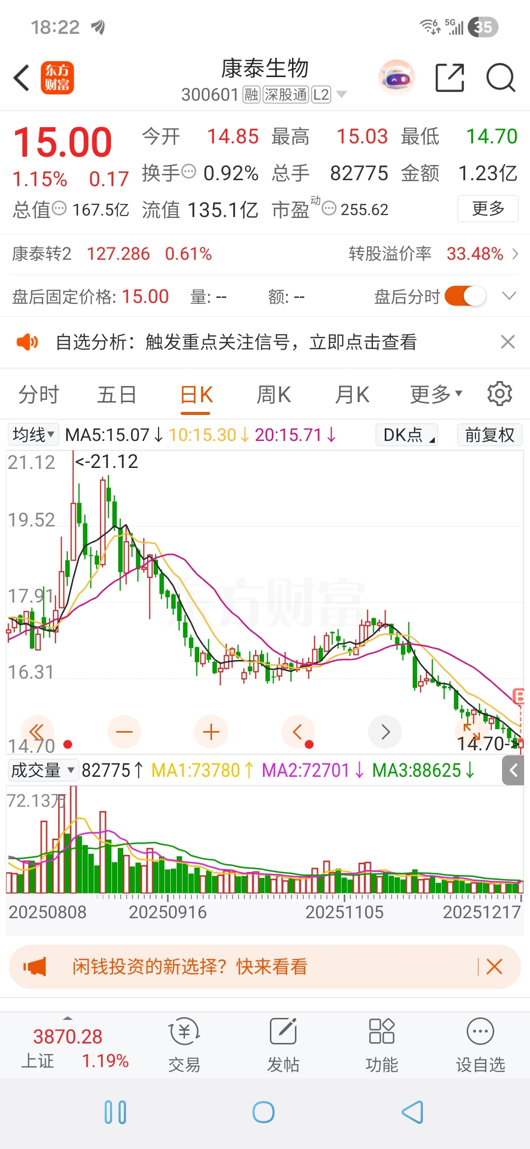 $康泰生物(SZ300601)$ 今天买的不知道会不会赚点钱,如果还不赚钱跌太狠就只能补仓了