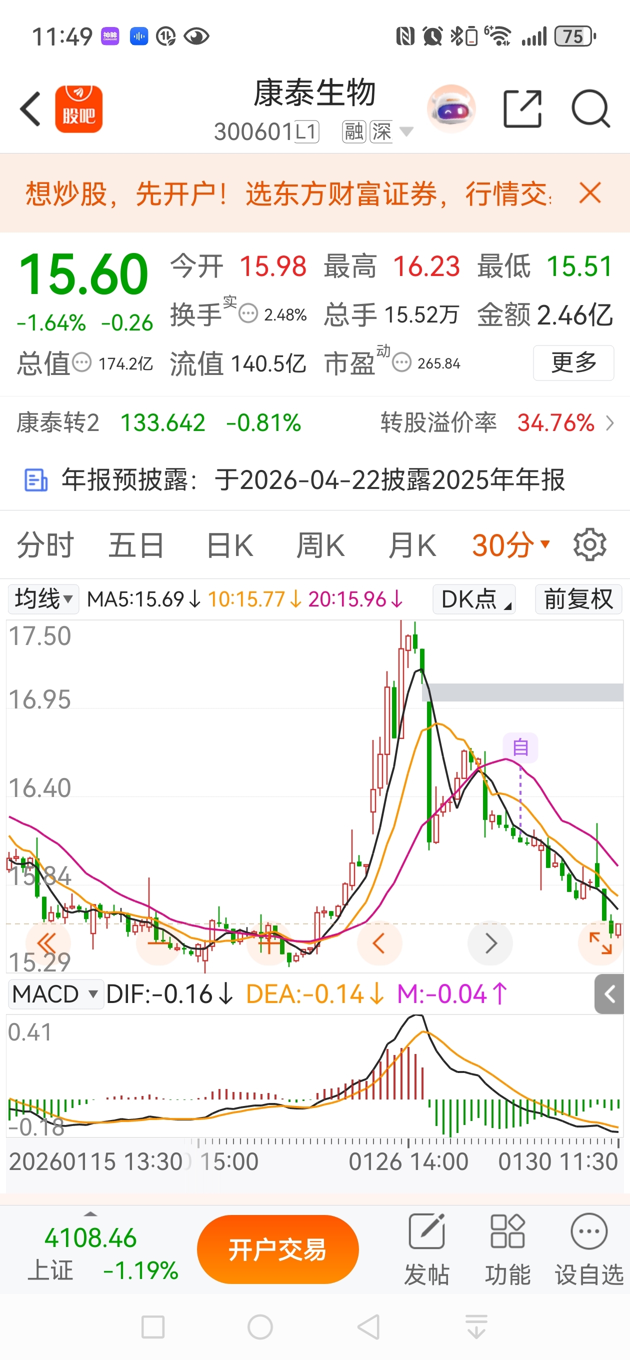 $康泰生物(SZ300601)$ 不要慌,15.5向下空间有限,股价持续创新低,30分钟macd绿柱能量在回缩了,下午可以进点货了,下周反弹一触即发