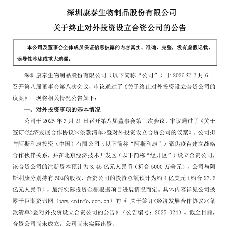 2月6日,康泰生物(300601)发布公告,称公司董事会审议通过议案,决定终止与阿斯利康投资(中国)有限公司合作设立疫苗领域合资公司的事项,此次终止未对公司产生重大不利影响。