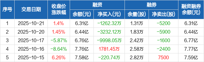 飞荣达融资融券信息显示,2025年10月21日融资净偿还1262.32万元;融资余额6.31亿元,较前一日下降1.96%。