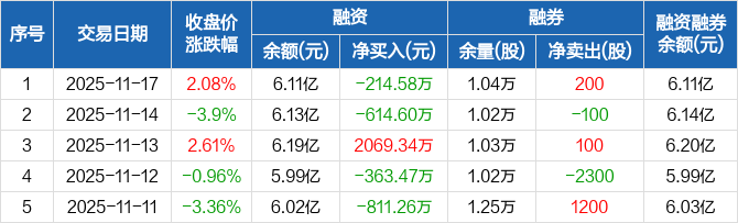 飞荣达:融资净偿还214.58万元,融资余额6.11亿元(11-17)