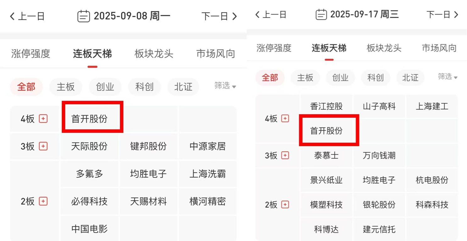 第一、二点都很好理解,像九月份来看两周的最高连板都是首开股份 ,那么首开股份在这两周内都是很明显的前排,这时即使9.17这天同身位还有不少连板股,比如山子高科 、上海建工 、香江控股 ,但我们再按这个原则往下看就会发现。