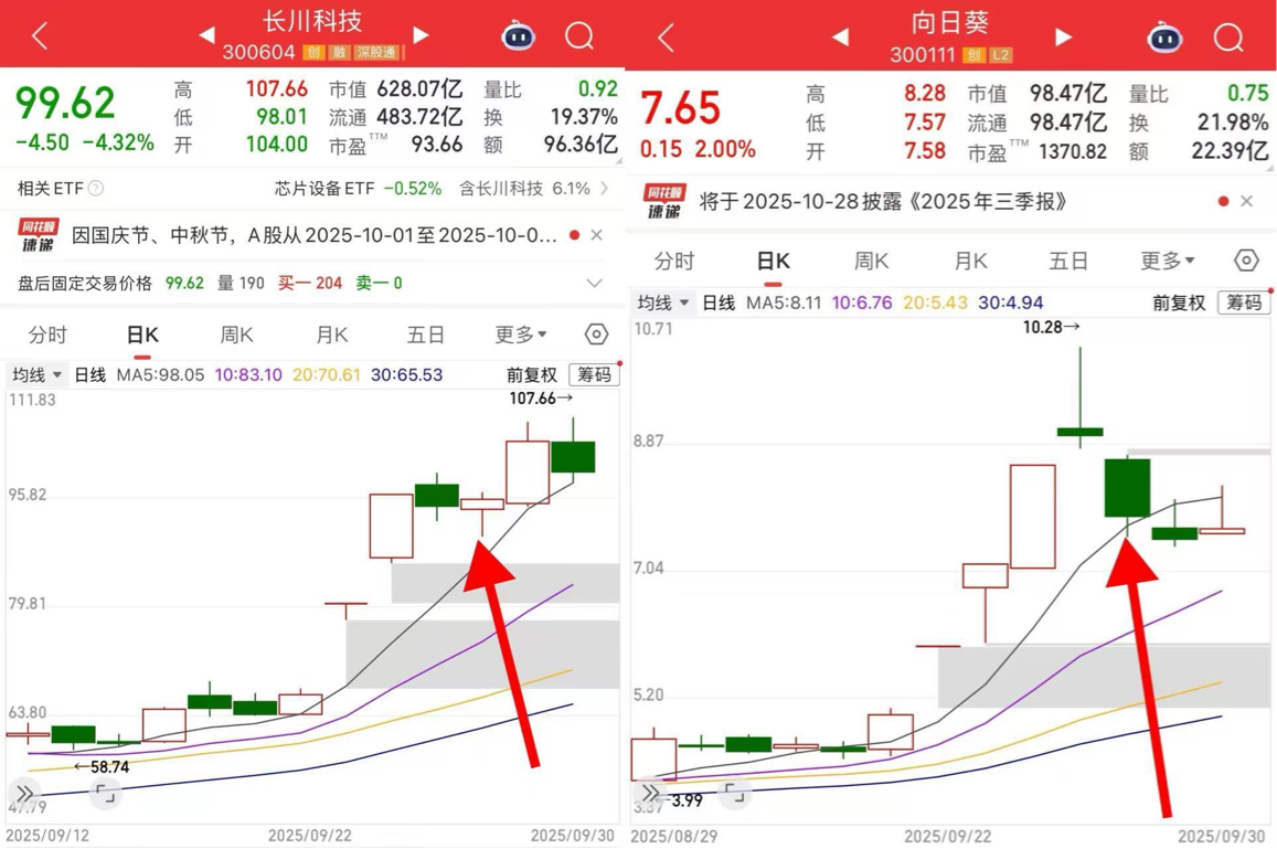 比如我们看九月末行情最强的题材是芯片半导体无疑,而赚钱效应也是主要聚集在20cm,因为九月末以前20cm是没有三连板的,而向日葵 早盘主动涨停硬板突破了20cm三连板高度压制,按我们上文来说突破当天也是很好的模式内关注点,毫无疑问的核心,而这时如果按向日葵三连板涨停时间来看,长川科技 晚于向日葵就是后排,所以如果要选择参与长川科技二连板还是向日葵三连板自然是后者,有龙做龙聚焦前排。