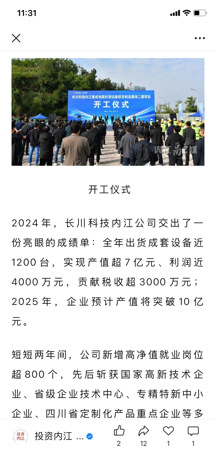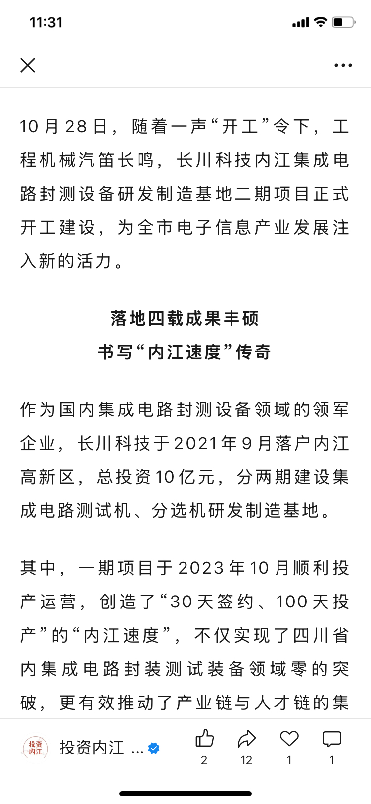 $长川科技(SZ300604)$ 长川科技内江集成电路封测设备研发制造基地二期项目正式开工建设