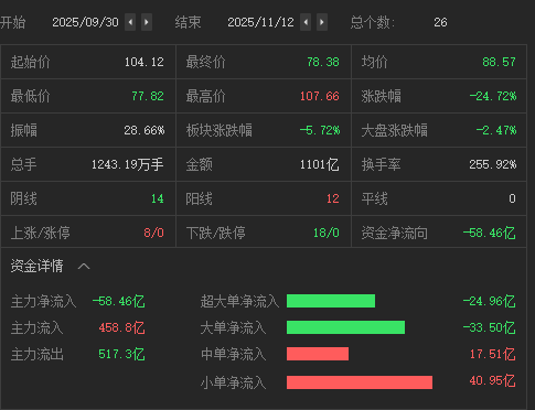 长川本次高点107.66下跌到今天上午收盘78.38,下跌26天,跌幅-24.7