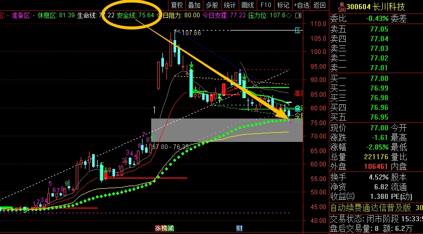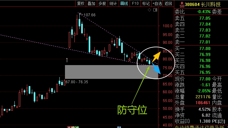 $长川科技(SZ300604)$ 前期冲高后,回落到现在调整了有一段时间,这里到了一个相对临界的区域,一个是脚底75.64位置安全线,另一个是三角收敛形态走到了末端,接下来主要就是看这个区域能否稳住,能稳住起码能看一个震荡的走势,如果兜不住就要注意再次的破位了,需要严格控制仓位应对,走稳回来再考虑回补。