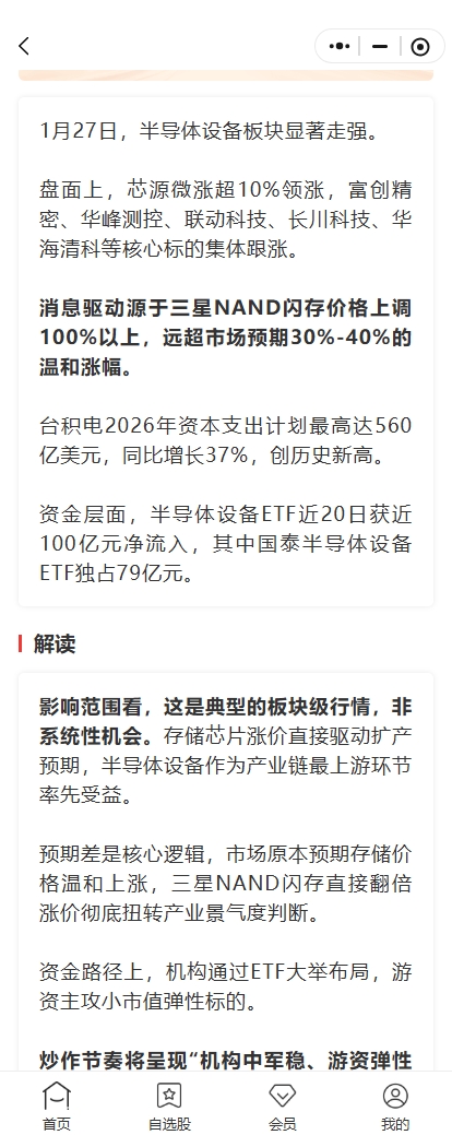 今天半导体设备板块表现亮眼,多只核心标的跟涨。希财舆情宝风口解读板块上给出了提示