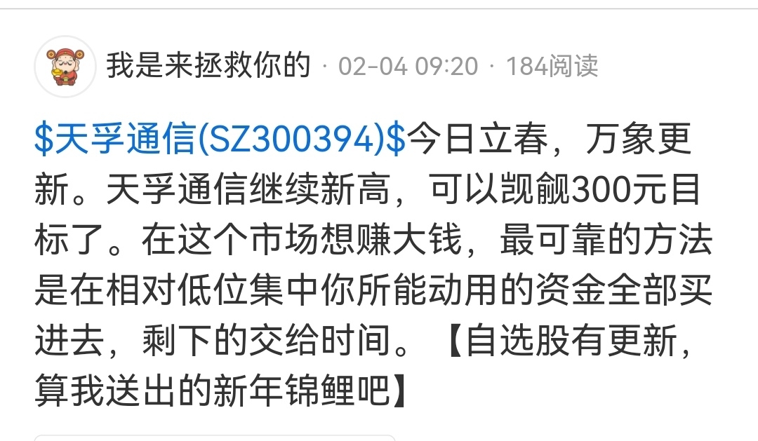 $长川科技(SZ300604)$ 立春之日说股价可以觊觎300元了,短短数个交易日后天孚通信股价已经无限接近400元。一路走来,产业逻辑远胜于涨涨跌跌的技术操作。也是能够一直笃定持有的基石所在。另外,当日送予大家的新年锦鲤长川科技也强势新高了。