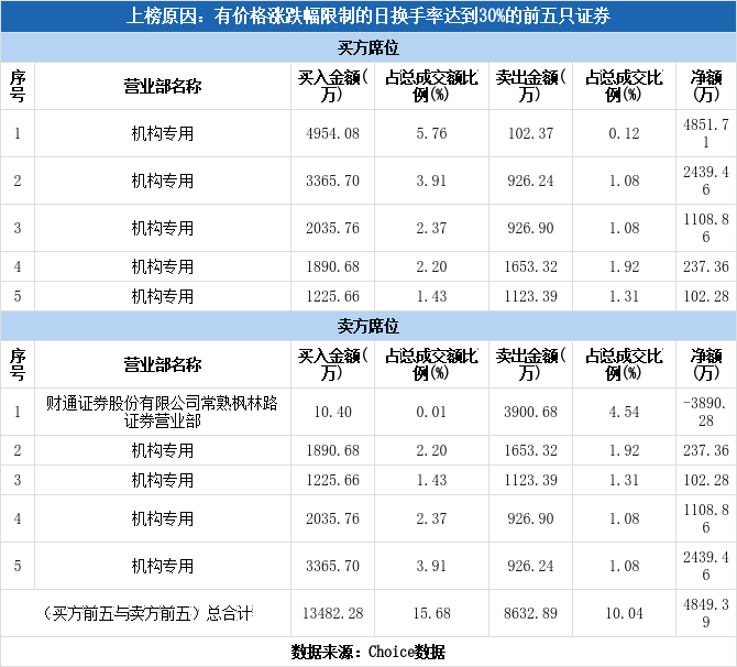 龙虎榜数据显示,今日共9个机构席位出现在龙虎榜单上,分别位列买一、买二、买三、买四、买五、卖二、卖三、卖四、卖五,合计净买入8739.66万元,占龙虎榜净买额的180.22%。除此之外还有航天发展、顺灏股份、国风新材等34只个股榜单上出现了机构的身影,其中19家呈现机构净买入,获净买入最多的是航天发展,净买额为1.67亿元;15家呈现机构净卖出,其中遭净卖出最高的为招商轮船,净卖额为9998.98万元。