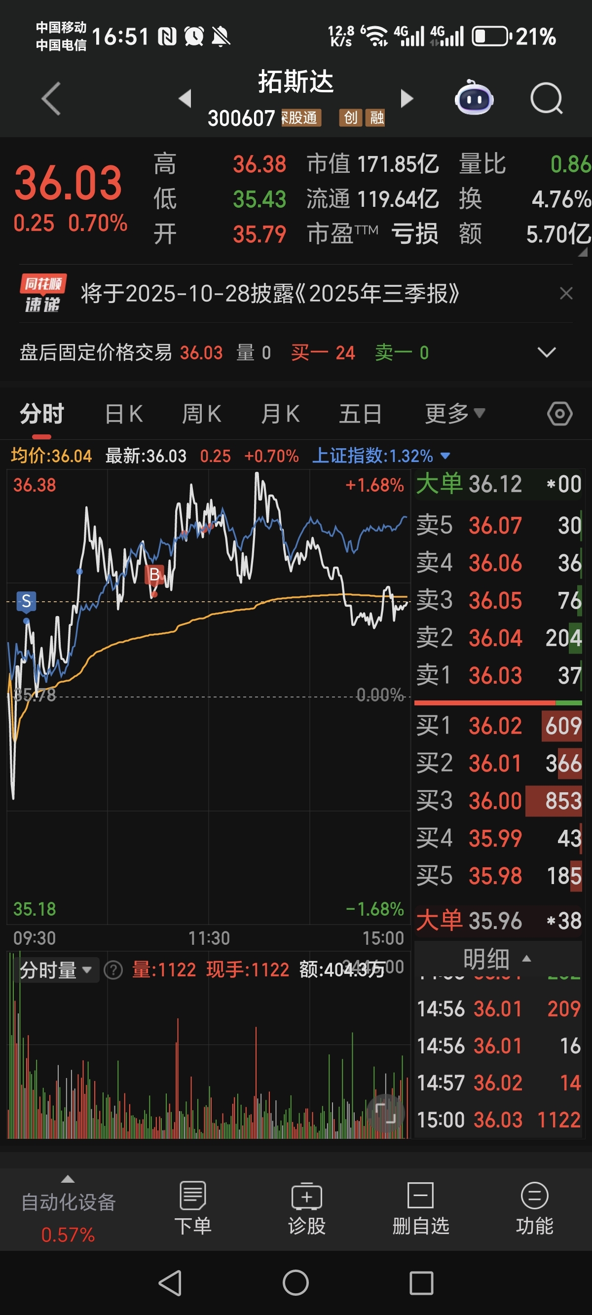 $拓斯达(SZ300607)$ 我的耐心已经被这个股全磨光了,9.18号进来到现在一直亏损中,今天又做反T,咋老子一卖你就开拉的样子,等老子一追高你立马坠机下落,真牛玩不过,明天应该是持股最后一天,目前17500股 36.87本了,认亏2.3%,玩不明白,好想哭死算球